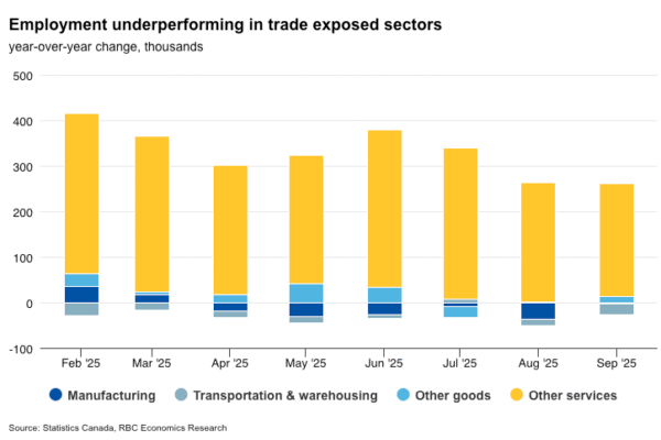 Heavily trade exposed industries like manufacturing and transportation services are expected to remain under pressure, but job growth in the rest of labour markets remains broadly positive.