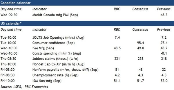A quiet week for Canadian economic data releases will leave focus on the external backdrop, particularly U.S. labour markets in Friday’s payroll employment report (as well as potential backward revisions.) The data is set for a release on Friday October 3rd – although that release could be delayed if a looming government shutdown on October 1st is not avoided.