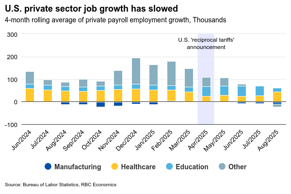 U.S. labour markets have been showing strain from increased trade frictions – employment growth has essentially stalled since “liberation day” in April. While the unemployment rate remained relatively low at 4.3% in August, it has increased over the past two months.