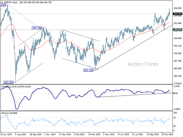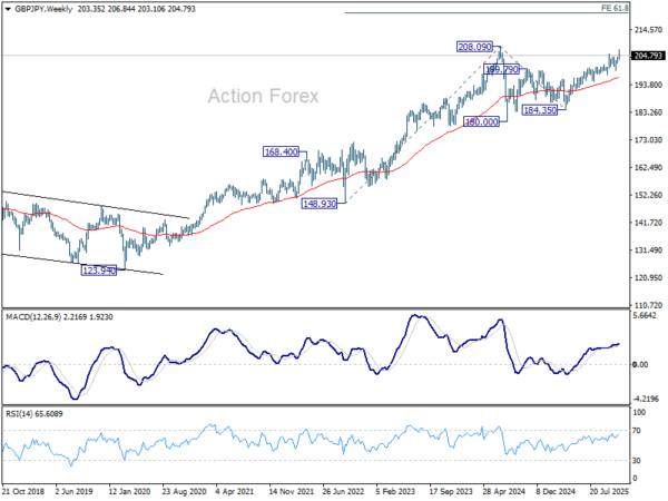 In the bigger picture, price actions from 208.09 (2024 high) are seen as a corrective pattern which might have completed at 184.35. Firm break of 208.09 high will resume the up trend from 123.94 (2020 low). Next target is 61.8% projection of 148.93 to 208.09 from 184.35 at 220.90. However, decisive break of 199.04 support will dampen this view and extend the corrective pattern with another fall.