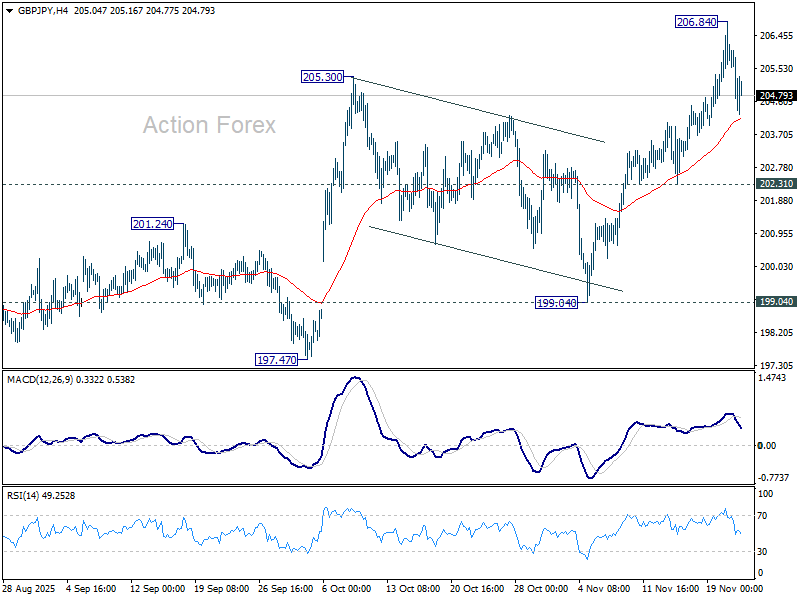 GBP/JPY’s rally from 184.35 resumed last week but lost momentum after hitting 206.84. Initial bias remains neutral this week for some consolidations. Downside of retreat should be contained by 202.31 support to bring another rise. Break of 206..84 will target 208.09 high. Decisive break there will confirm long term up trend resumption.