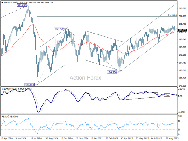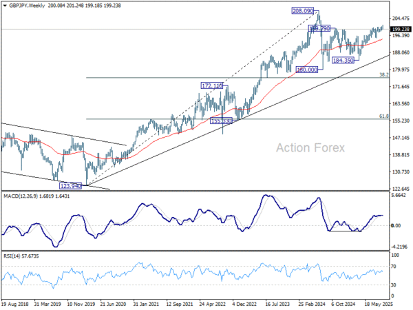 In the bigger picture, price actions from 208.09 (2024 high) are seen as a correction to rally from 123.94 (2020 low). The pattern might still extend with another falling leg. But in that case, strong support should be seen from 38.2% retracement of 123.94 to 208.09 at 175.94 to contain downside. Meanwhile, decisive break of 208.09 will confirm long term up trend resumption.