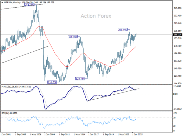 In the long term picture, there is no sign that the long term up trend from 122.75 (2016 low) has concluded. But firm break of 208.09 is needed to confirm resumption. Otherwise, more medium term range trading could still be seen.
