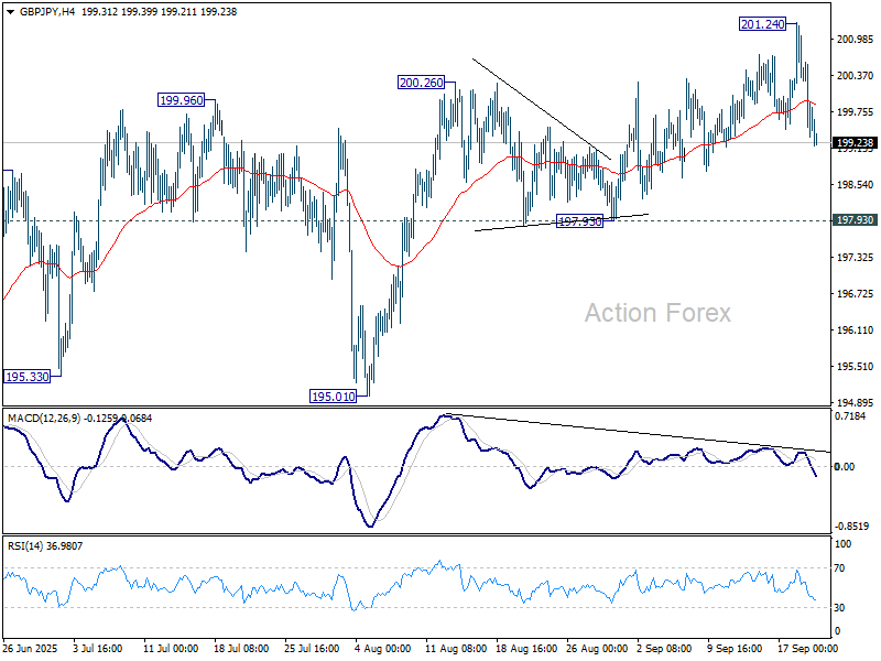 GBP/JPY rose to 201.24 last week but retreated sharply from there. Nevertheless, downside is contained well above 197.93 support so far. Initial bias remains neutral for consolidations, and further rise is still in favor. On the upside, break of 201.24 will target 100% projection of 180.00 to 199.79 from 184.35 at 204.14. However, considering bearish divergence condition in both D and 4H MACD, firm break of 197.93 will indicate bearish reversal and bring deeper fall back to 195.01 support first.