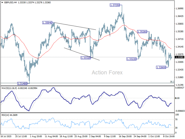 GBP/USD is staying in consolidations above 1.3260 temporary low and intraday bias remains neutral. Overall outlook is unchanged that corrective pattern from 1.3787 is extending. Below 1.3260 will bring deeper decline but strong support should be seen from 1.3140 cluster (38.2% retracement of 1.2099 to 1.3787 at 1.3142) to contain downside. On the upside, break of 1.3526 will bring stronger rally back to retest 1.3728/87 resistance zone.