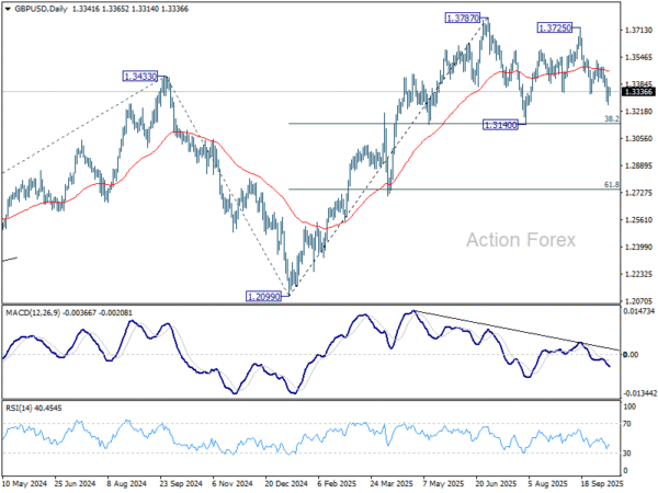 In the bigger picture, rise from 1.0351 (2022 low) is still seen as a corrective move. Further rally could be seen to 61.8% projection of 1.0351 to 1.3433 (2024 high) from 1.2099 (2025 low) at 1.4004. But strong resistance could emerge from 1.4248 (2021 high) to limit upside. Sustained break of 55 W EMA (now at 1.3173) will argue that a medium term top has already formed and bring deeper fall back to 1.2099.