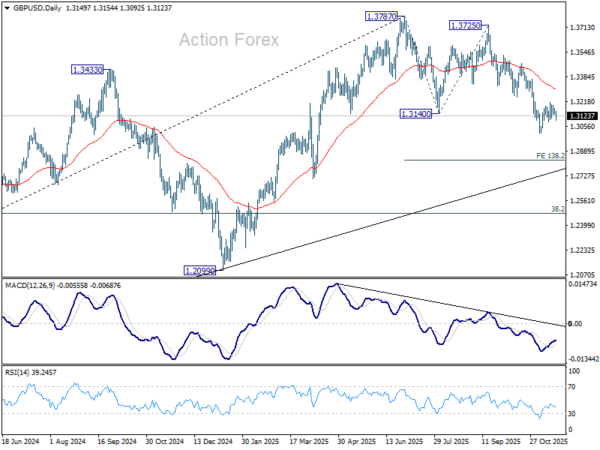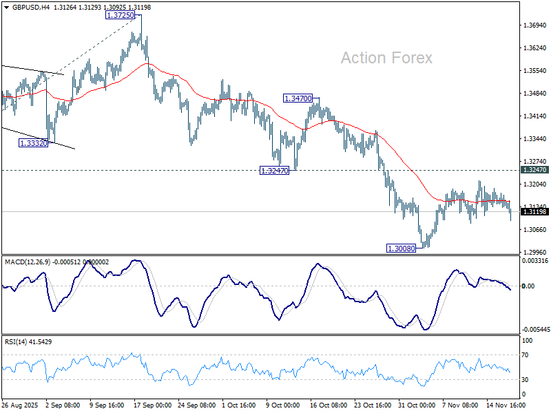 GBP/USD dips mildly today but stays in range above 1.3008. Intraday bias remains neutral at this point. Further decline is expected as long as 1.3247 support turned resistance holds. Break of 1.3008 will resume the fall from 1.3787, and target 138.2% projection of 1.3787 to 1.3140 from 1.3725 at 1.2831. Nevertheless, firm break of 1.3247 will suggest that fall from 1.3787 has completed as a corrective move already.