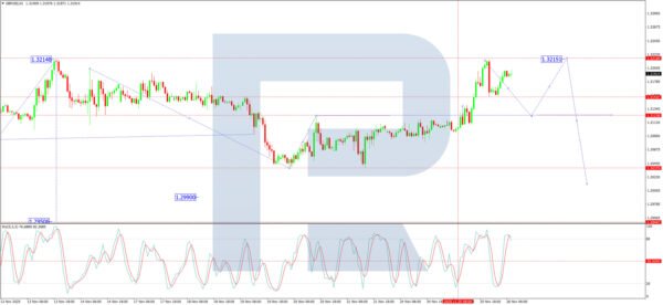 On the H1 chart, the pair broke upwards from a pronounced consolidation range around 1.3123, reaching its initial target at 1.3210. A decline to retest 1.3123 is now expected. This should be followed by a final upward push to 1.3215, at which point the corrective potential is likely to be exhausted.