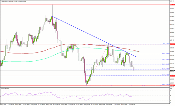 - A major bearish trend line is forming with resistance near 1.3470 on the 4-hour chart.