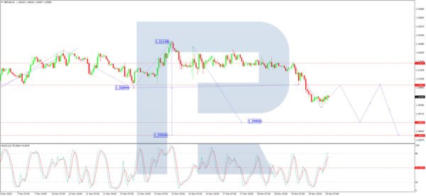 On the H1 chart, the pair broke downwards from a consolidation range around 1.3090, confirming the continuation of the bearish impulse. The immediate target for this leg is 1.3030. A corrective bounce to retest the 1.3090 level from below is likely before the next wave of selling takes the pair down to 1.2990 and potentially towards 1.2950. The Stochastic oscillator aligns with this view. Its signal line is above 50, indicating that a short-lived corrective bounce is underway before the dominant downtrend reasserts itself.