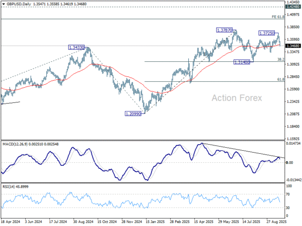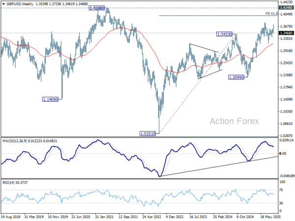 In the bigger picture, rise from 1.3051 (2022 low) is in progress, and would target 61.8% projection of 1.0351 to 1.3433 (2024 high) from 1.2099 (2025 low) at 1.4004. However, with 1.4248 resistance (2021 high) intact, this rally is more likely a corrective move. Sustained break of 55 W EMA (now at 1.3146) will argue that a medium term top has already formed and bring deeper fall back to 1.2099.