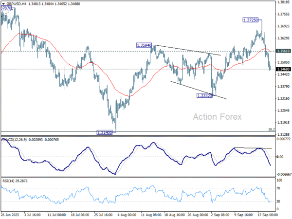 GBP/USD spiked higher to 1.3725 last week but reversed from there. The development suggests that rebound from 1.3140 has completed, and corrective pattern from 1.3787 high is already in the third leg. Initial bias stays on the downside this week for 1.3332 support first. Break there will bring deeper fall to 1.3140. On the upside, though, above 1.3561 minor resistance will turn intraday bias neutral.