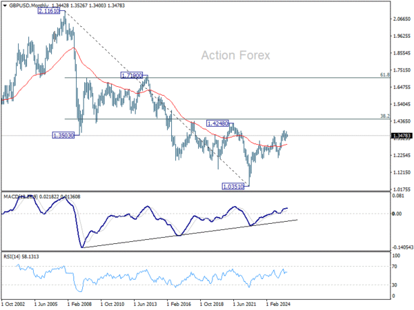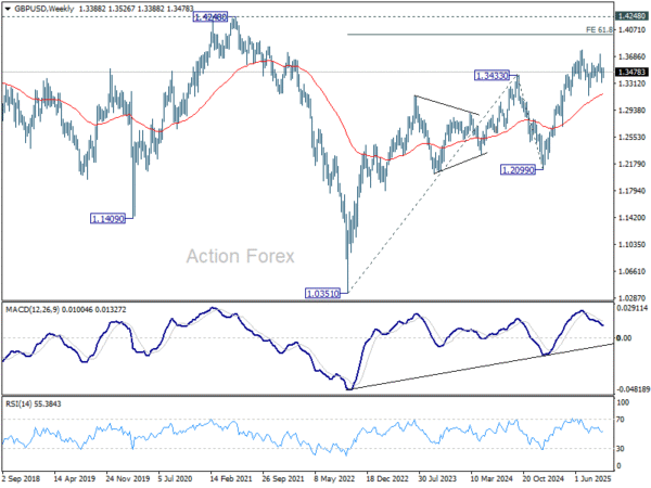 In the bigger picture, rise from 1.0351 (2022 low) is still seen as a corrective move. Further rally could be seen to 61.8% projection of 1.0351 to 1.3433 (2024 high) from 1.2099 (2025 low) at 1.4004. But strong resistance could be seen from 1.4248 (2021 high) to limit upside. Sustained break of 55 W EMA (now at 1.3166) will argue that a medium term top has already formed and bring deeper fall back to 1.2099.