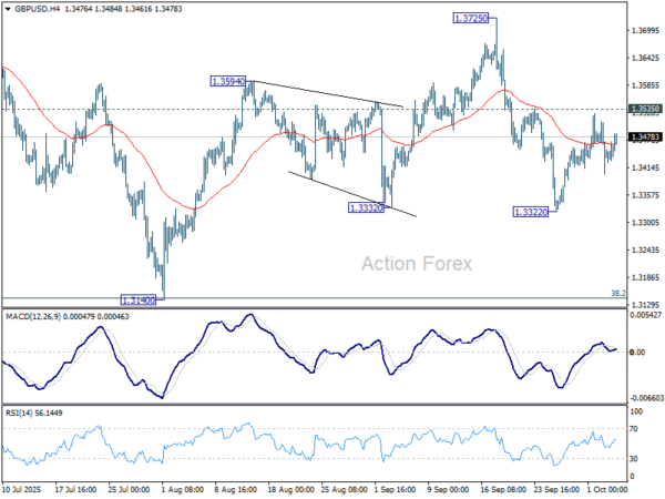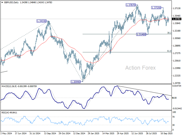 GBP/USD’s recovery from 1.3322 extended higher last week, but failed to break through 1.3535 resistance. Initial bias remains neutral this week and further decline is in favor. Break of 1.3322 will resume the fall from 1.3725 to 1.3140 support. On the upside, though, firm break of 1.3535 will argue that pullback from 1.3725 has already completed, and bring stronger rise to retest 1.3725/87 key resistance zone.