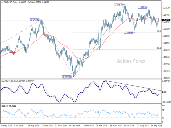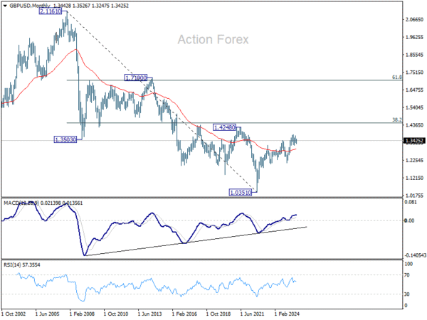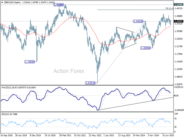 In the bigger picture, rise from 1.0351 (2022 low) is still seen as a corrective move. Further rally could be seen to 61.8% projection of 1.0351 to 1.3433 (2024 high) from 1.2099 (2025 low) at 1.4004. But strong resistance could emerge from 1.4248 (2021 high) to limit upside. Sustained break of 55 W EMA (now at 1.3173) will argue that a medium term top has already formed and bring deeper fall back to 1.2099.