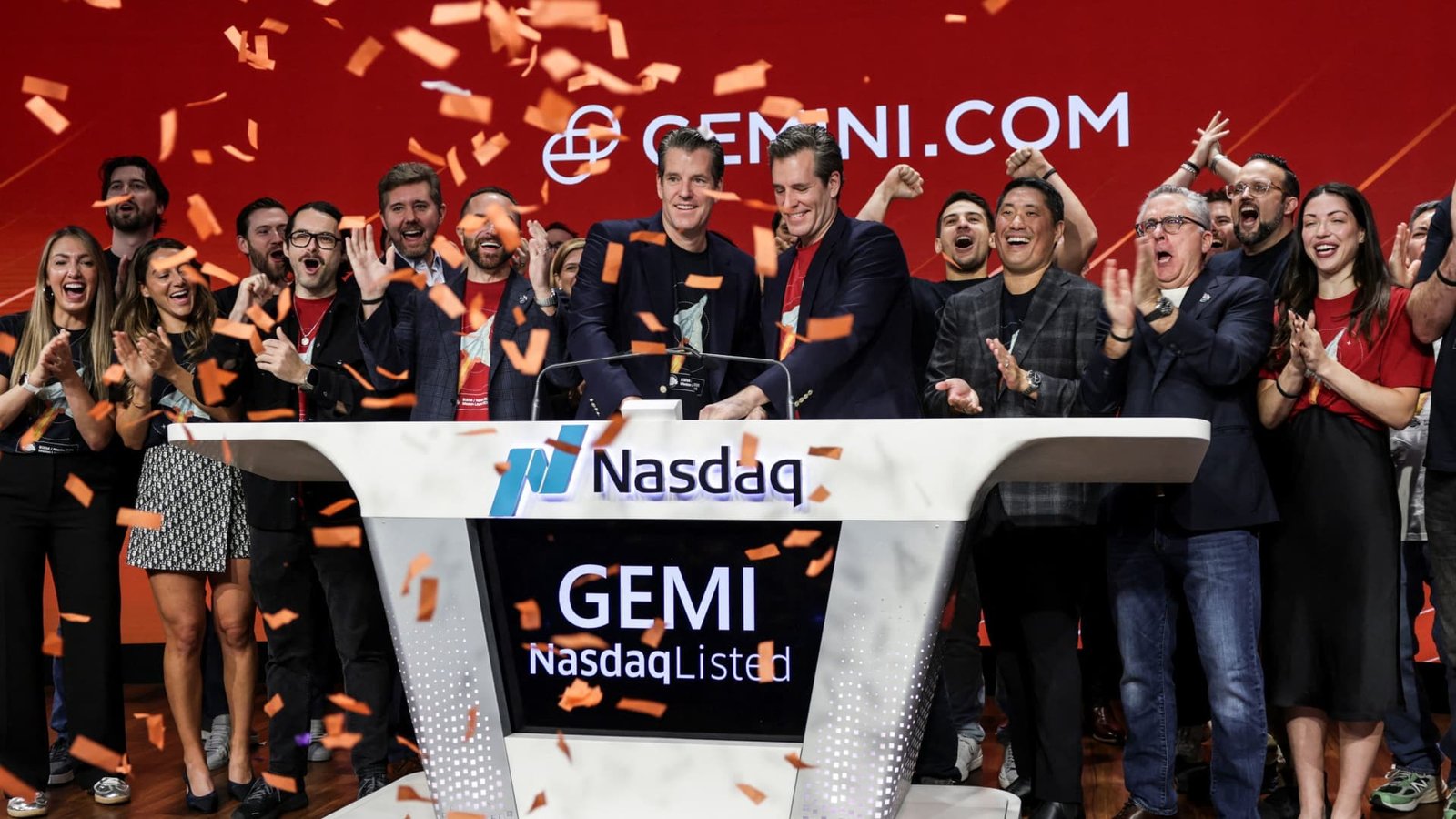 Gemini Co-founders Tyler Winklevoss and Cameron Winklevoss attend the company’s IPO at the Nasdaq MarketSite in New York City, U.S., Sept. 12, 2025.
