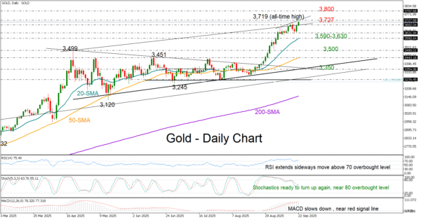 Gold started the week on positive note, edging softly up to unlock a new record high of 3,719 thanks to Friday’s quick rebound near the 3,630 support area.