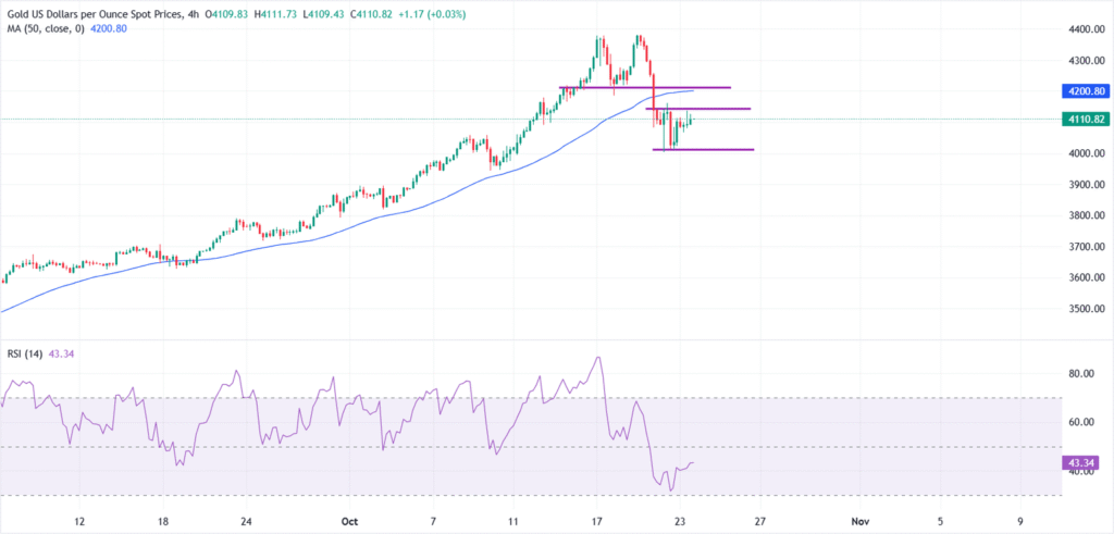Gold (XAU/USD) fluctuates within a tight range on Thursday, consolidating after a sharp correction from historic highs. At the time of writing, XAU/USD is trading around $4,150, edging modestly higher after two days of declines as safe-haven demand remains supported amid a mix of economic jitters and geopolitical tensions.