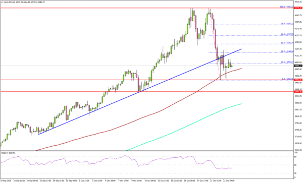 It tested $4,000 and is currently consolidating losses. On the upside, immediate resistance is near the $4,150 level. The next major resistance sits near the $4,180 level.