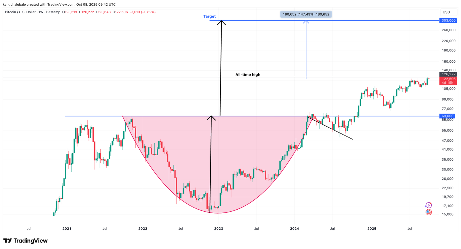 That puts Bitcoin’s cup-and-handle breakout target for 2025–2026 at around $303,000, according to chartist Gert van Lagen.