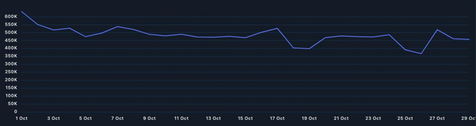 These include declining network activity, pointing to reduced onchain demand. Data from Nansen reveals that the number of daily active addresses on the Bitcoin network decreased by 30% in October, from 632,915 to 447,225.