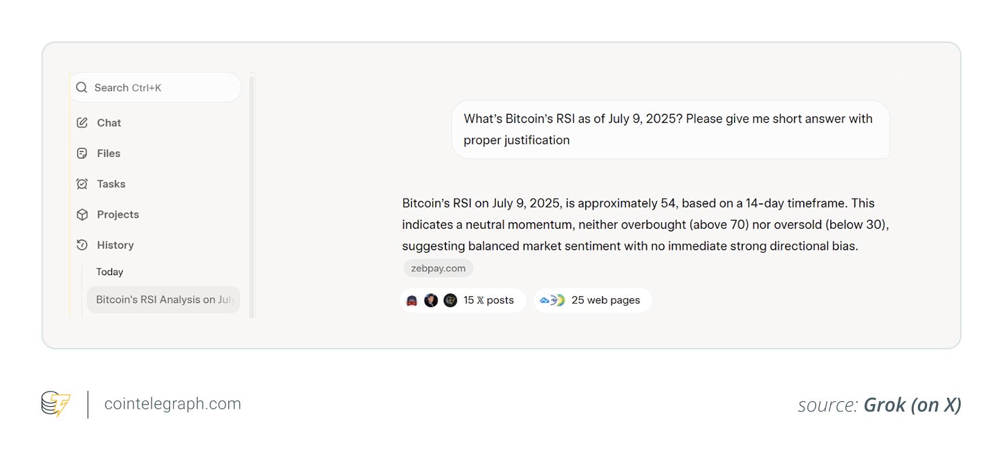 According to Grok, Bitcoin’s RSI is 54 on July 9, 2025, using a 14-day timeframe, indicating neutral momentum (see image below).