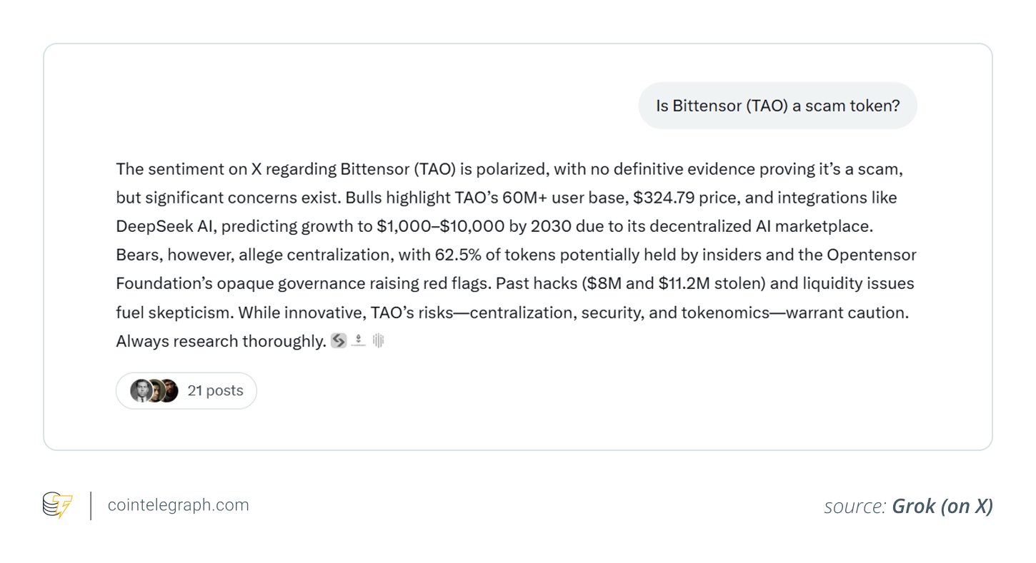 Use case: The Grok output highlights bullish sentiment driven by TAO’s user base, integrations and long-term growth potential.