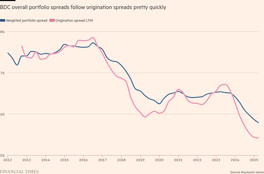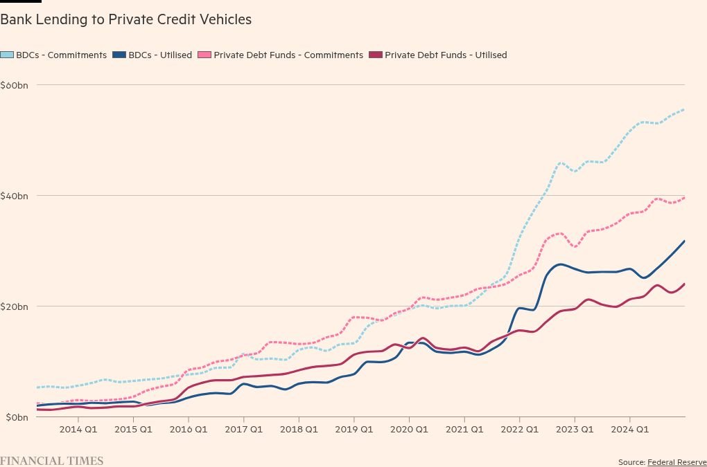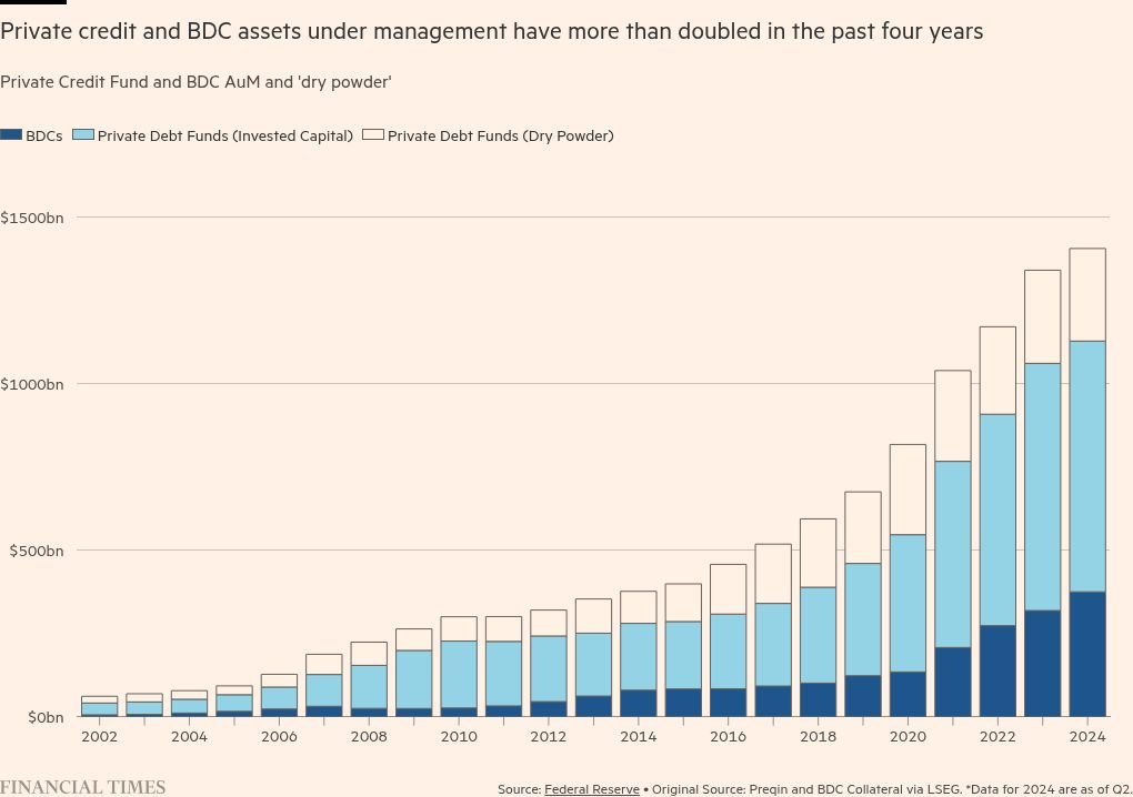 One way investors can get exposure to loans has been through “Business Development Companies” — weird US legal structures set up in the 1980s to encourage venture capital, but which now serve overwhelmingly as a portal into the private credit industry. Their assets under management have exploded over the past few years and are attracting increasing numbers of regulatory eyeballs. As the Federal Reserve wrote in a May report: