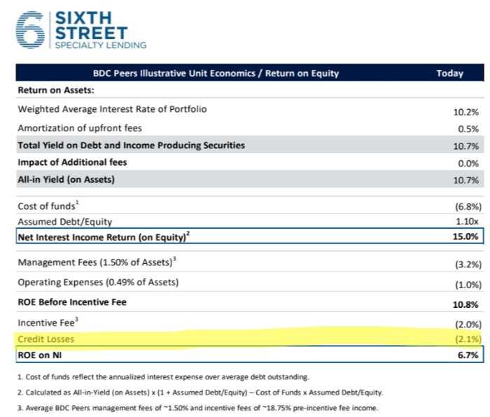 To get a sense as to how sensitive BDC shareholder returns can be to credit losses, we’ve borrowed a model that featured in Josh Easterly’s April shareholder letter. Easterly is co-CIO and one of the founding partners of Sixth Street — one of the most prominent private credit managers — so while his outline of BDC unit economics is a mere sketch, it’s a well-informed sketch.