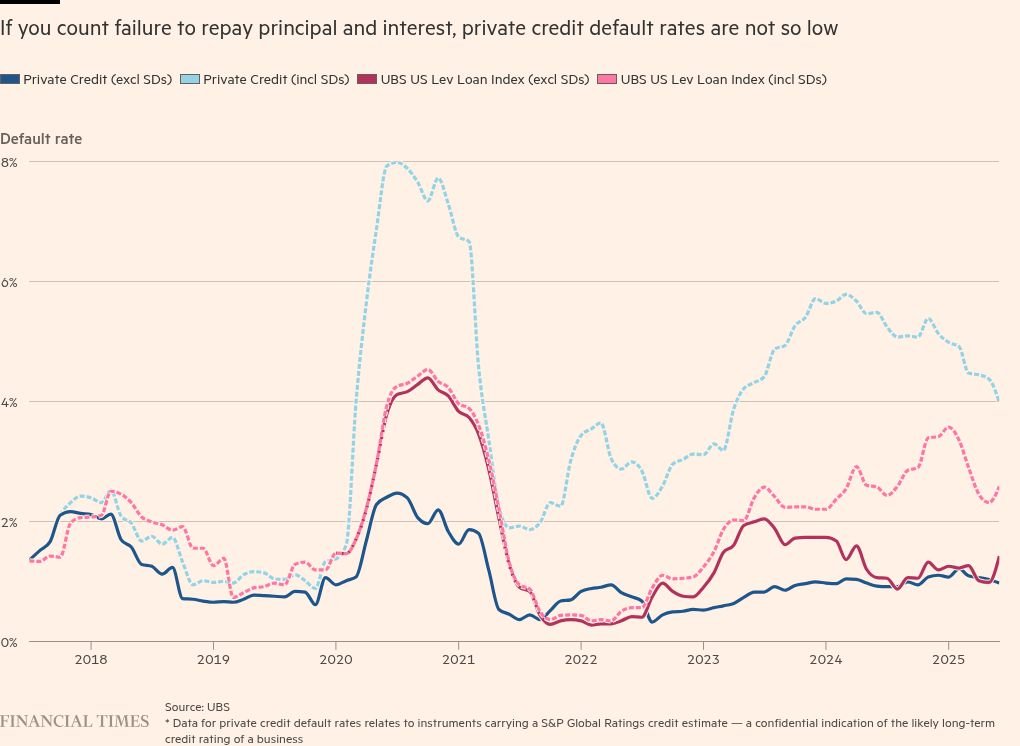 Once we include these Selective Default events the private credit default rate roughly quintuples. And according to Lincoln International this “shadow default rate” among direct lending crept up further to 6 per cent in Q2 2025.