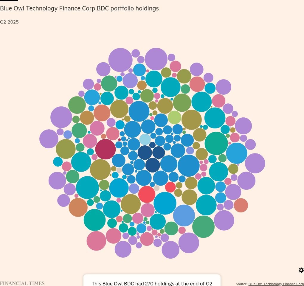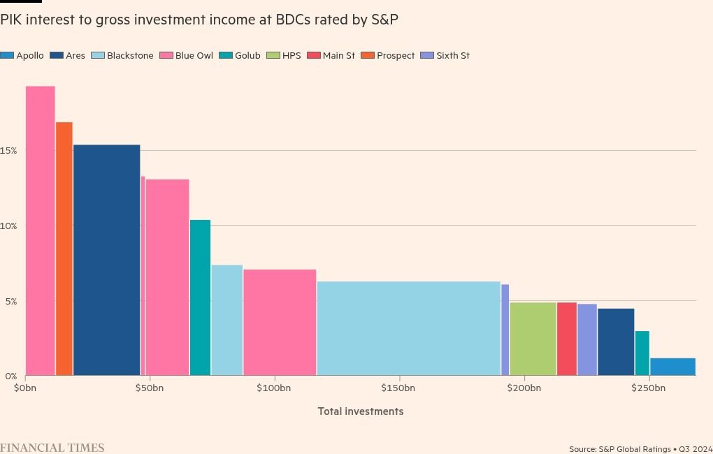 The BDC with the highest concentration of PIK interest to gross investment income, according to S&P Global Ratings, is Blue Owl Technology Finance Corp BDC, a $12bn publicly traded fund that specialises in — you’ve guessed it — financing technology companies.