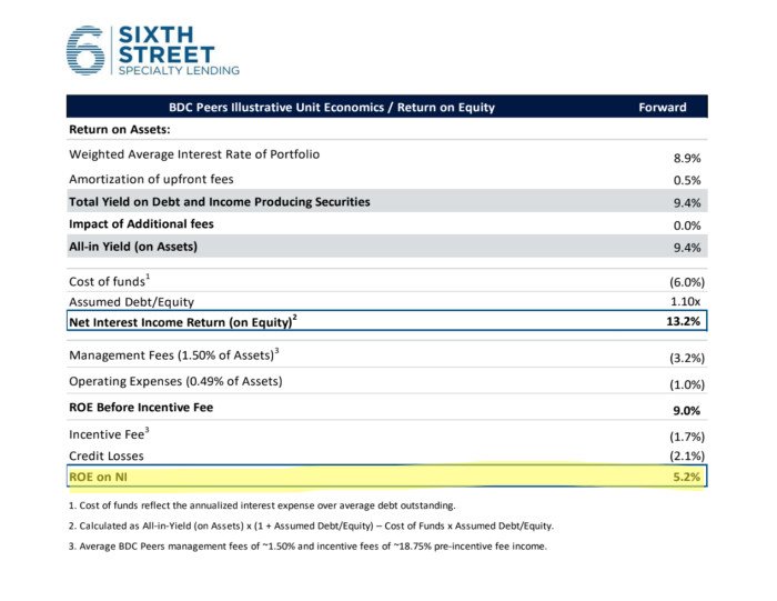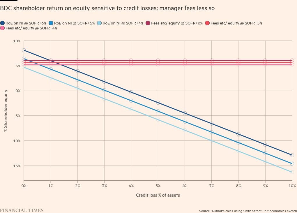 In fact, we used the Sixth Street framework to sketch out how manager fees and shareholder return on equity would fare under different scenarios for overall loan spreads and credit losses: