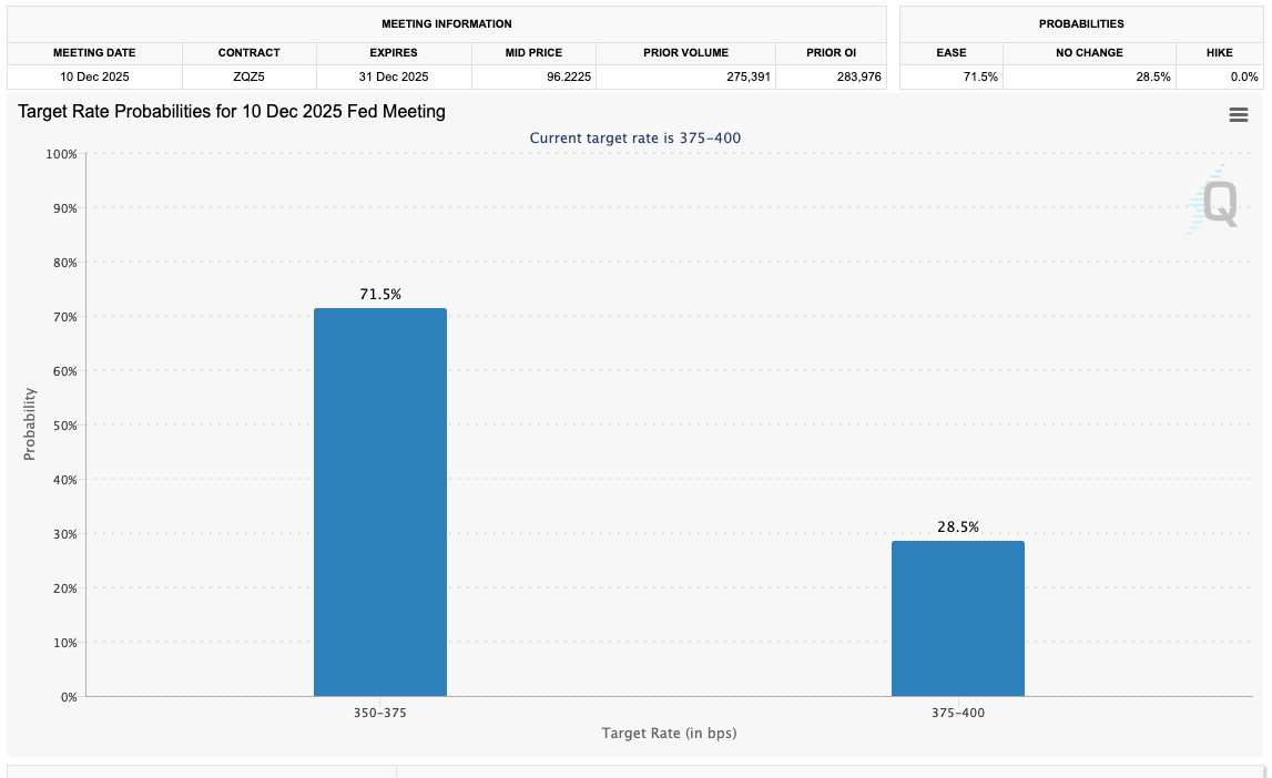 The latest odds from CME Group’s FedWatch Tool indicate that expectations of a 0.25% cut at the Fed’s December meeting are now around 70%.