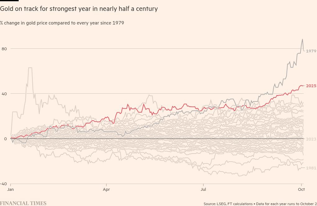 This year is gold’s biggest rally since the 1970s and it is largely being stoked by FOMO — a fear of missing out by investors. The bullion price has rocketed nearly 50 per cent this year to a record high of $3,930 a troy ounce after Trump’s trade war sparked a rush to haven assets and sent the dollar tumbling.