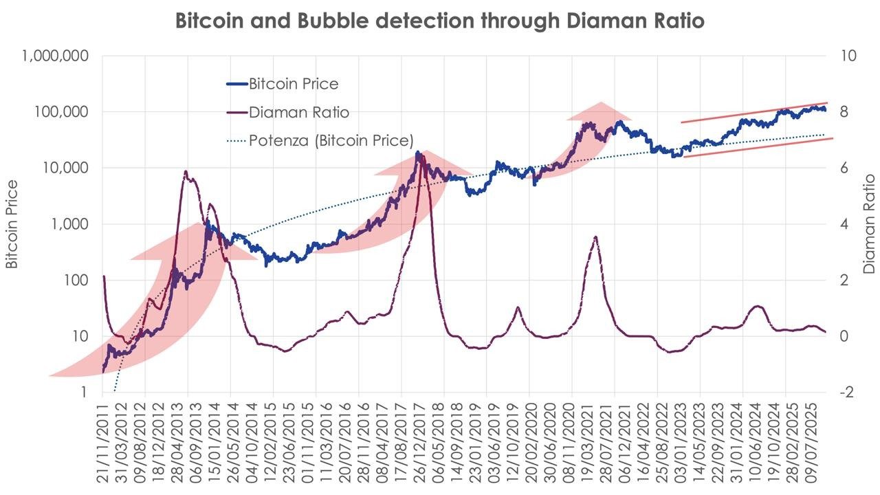 On four occasions, Bitcoin can be considered to be in a ‘bubble’ phase, i.e., with more than exponential returns, but unlike traditional bubbles that then burst in a few months, Bitcoin has shown resilience in its growth, which on average has a Diaman Ratio of less than 1 with high but not exponential growth. In fact, a power law can describe the growth of Bitcoin’s price very well.