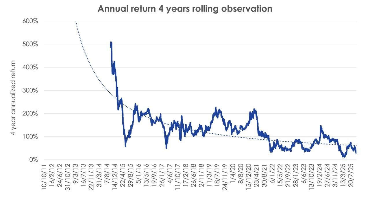 The chart above shows that average annual returns have gradually declined, with no peaks at all in the last cycle, confirming the hypothesis that Bitcoin’s risk-return structure has changed. Yet the price of Bitcoin has risen from $15,000 in December 2022 to $126,000 at recent highs, so a very attractive return has still been achieved in this cycle, but with less fanfare than in previous cycles.