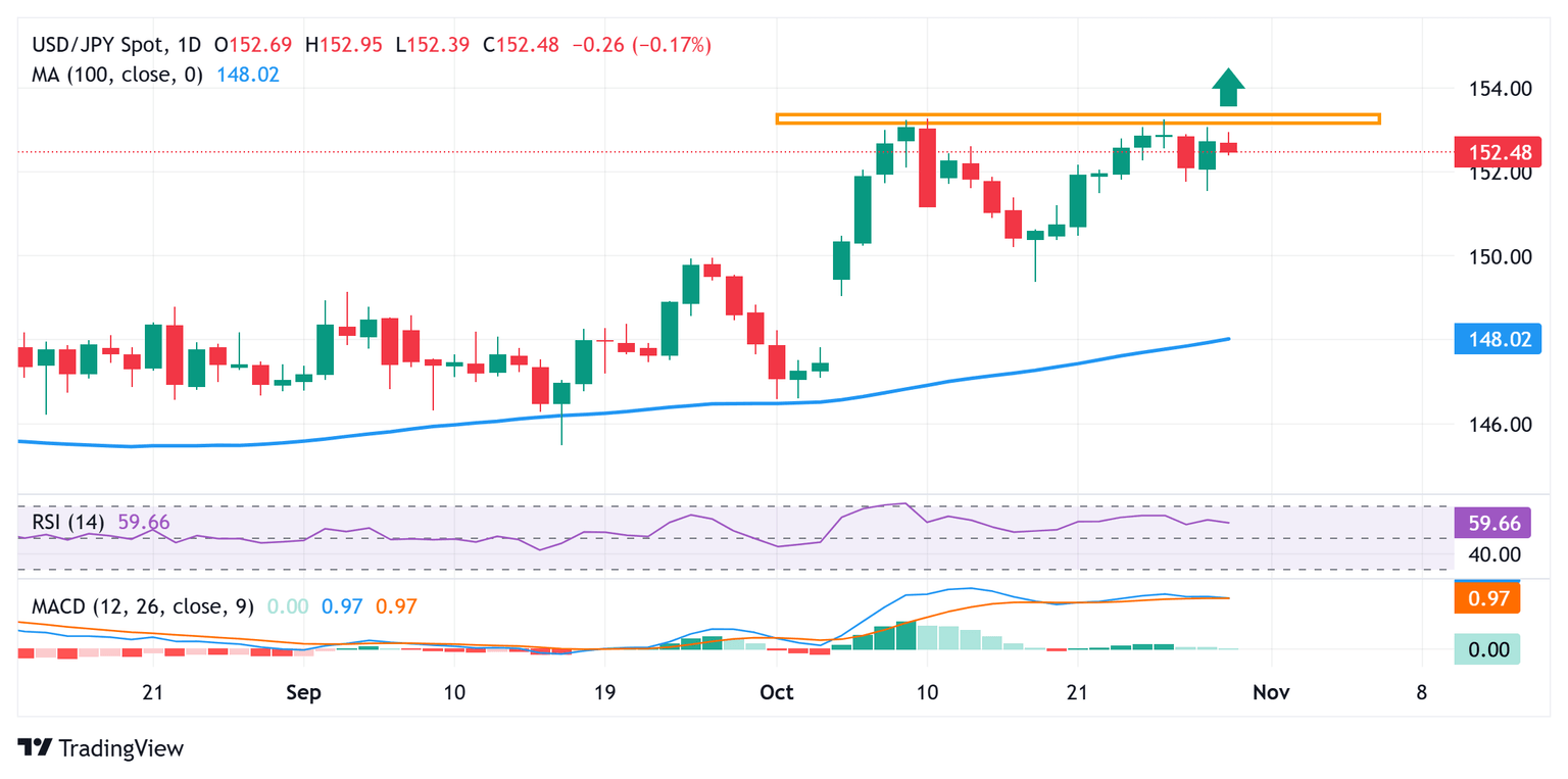 The USD/JPY pair struggles to find acceptance above the 153.00 mark and remains below the 153.25-153.30 supply zone, or the monthly peak retested earlier this week. The subsequent fall favors bearish traders, though positive oscillators on the daily chart back the case for the emergence of dip-buyers near the 152.00 round figure. A convincing break below the said handle would expose the overnight swing low, around the 151.55-151.50 region, before spot prices extend the slide further towards the 151.10-151.00 pivotal support. Some follow-through selling would confirm a fresh breakdown and pave the way for deeper losses.
