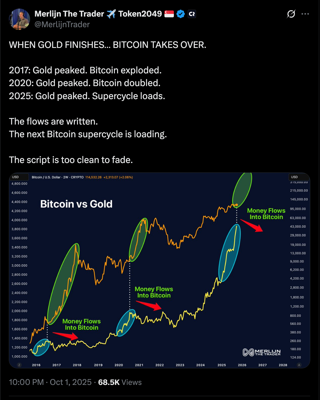 Based on this ratio, Bitcoin’s current $2.3 trillion market capitalization would need to climb by roughly 42%, implying a theoretical BTC price of around $165,000, to match the estimated $6 trillion in private gold holdings across ETFs, bars, and coins.