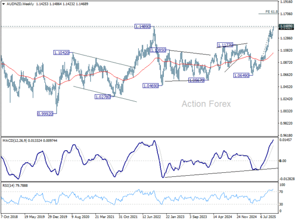 Technically, AUD/NZD is testing the 1.1489 resistance, its highest level since 2022. A decisive break above this zone would confirm bullish continuation and open the way toward the 61.8% projection of 1.0744 to 1.1443 from 1.1275 at 1.1707.