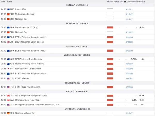 Attention will turn to the Reserve Bank of New Zealand rate decision on Wednesday. Markets are expecting the Reserve Bank of New Zealand (RBNZ) will lower its interest rate by 0.25% on October 8th, which is what most experts and market pricing currently expect.