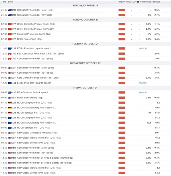 GDP and Property: Official data is likely to show China’s third-quarter economic growth slowed substantially to around 4.5% for the year. Key monthly data on retail sales and factory output are also expected to show a deceleration. Additionally, data on property prices is expected to confirm the market is still weak, as the government has not yet announced any major new stimulus to turn the sector around.