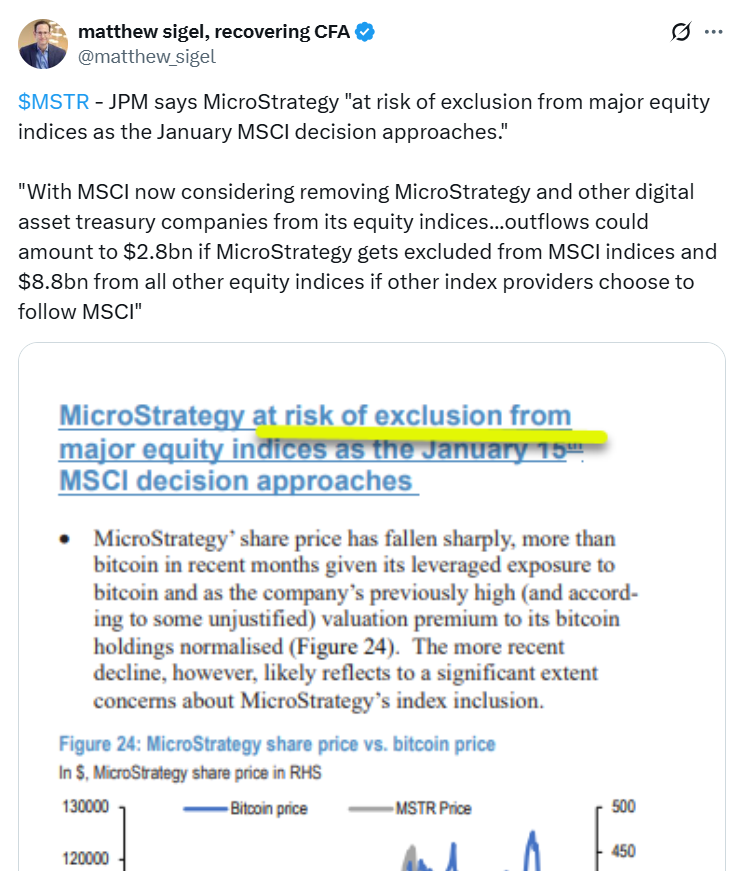 The MSCI Index announced in October that it was consulting with the investment community about whether to exclude Bitcoin (BTC) and other digital asset treasury companies (DATs) that have a balance sheet with more than 50% crypto assets.