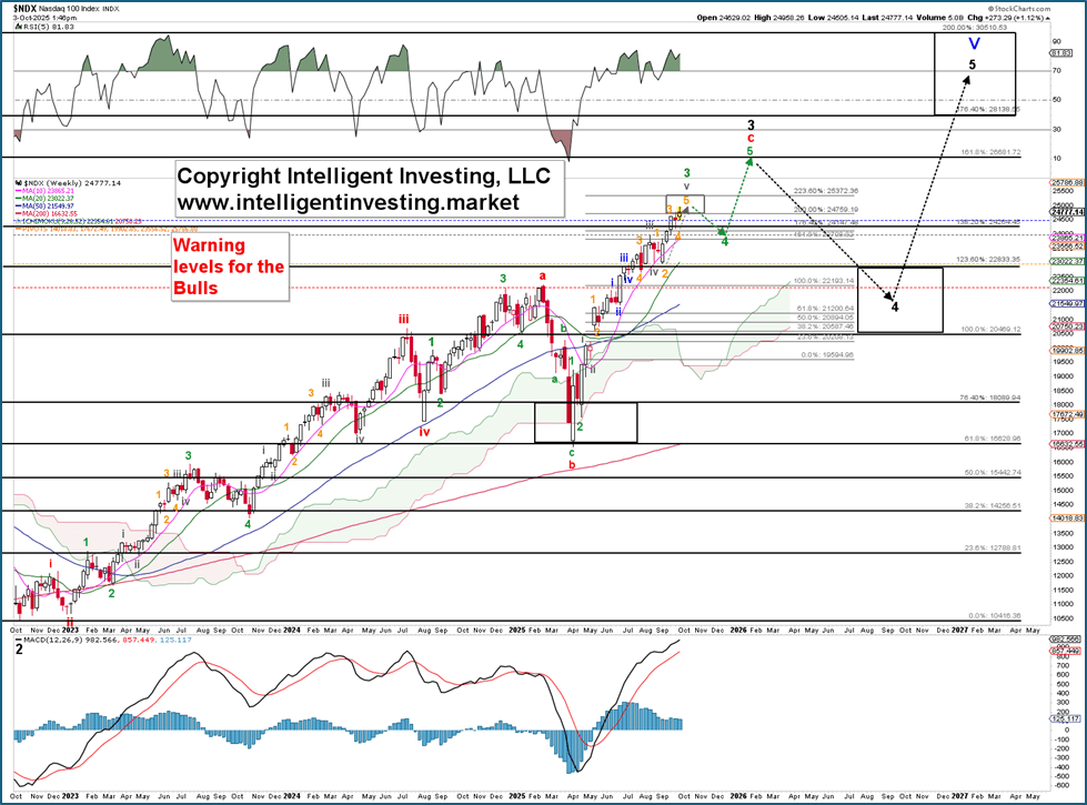 Fast forward two weeks, and the index reached 24958 today. It is perfectly within the ideal target zone and reversed intra-day. Therefore, the odds are increasing that the intermediate (green) W-3 top has been hit. See Figure 1 below.