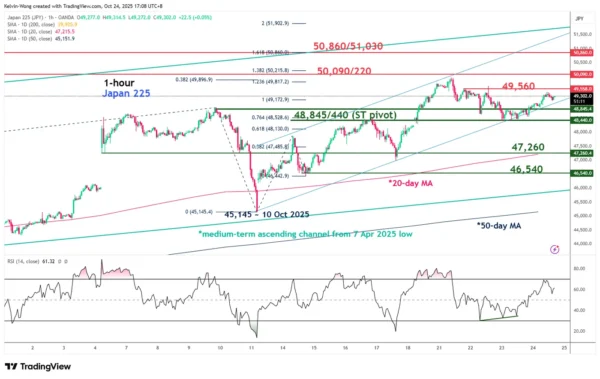 However, the Japanese stock market appears to have already priced in expectations of an aggressive expansionary fiscal policy, as hinted in Prime Minister Takaichi’s previous speeches. The Japan 225 CFD Index has since declined by 3.4% from its all-time high on 21 October 2025, hitting an intraday low of 48,415 on Thursday, 23 October 2025.