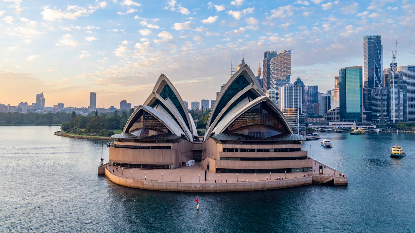 Sydney Opera House, designed by Danish architect Mr Jorn Oberg Utzon, at first light as the sun rises over Sydney harbor and city center skyscrapers.