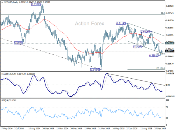 But outlook will stay bearish as long as 0.5844 resistance holds. Firm break of 0.5681 will resume the whole fall from 0.6119 to 161.8% projection at 0.5488, which is close to 0.5484 key support (2025 low so far).