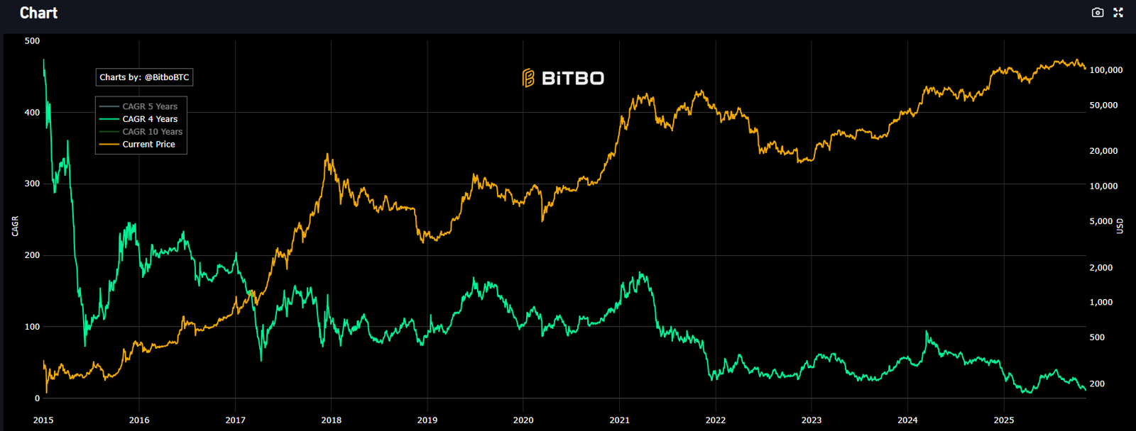 Bitcoin’s CAGR over the last four years has been steadily declining and dropped into single digits for the first time in April. As of Nov. 10, it’s around 13%, according to Bitbo.