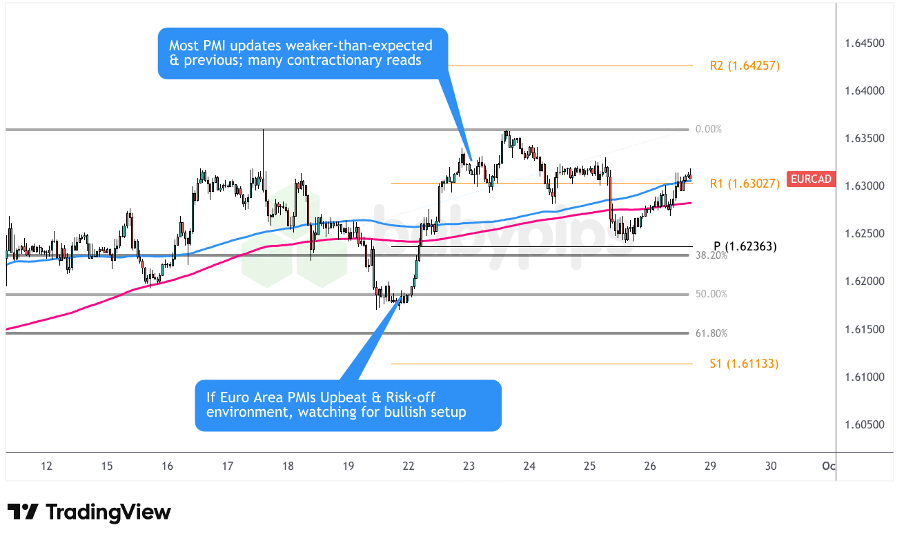EUR/CAD was consolidating slightly above the R1 Pivot resistance at 1.6302 when the PMI data was released and invalidated this setup from moving beyond the Watchlist stage. We saw an initial bearish reaction, which found support at this inflection point, then surprisingly rallied up to the 1.6350 minor psychological level as the Loonie appeared to trail USD weakness early in the week.
