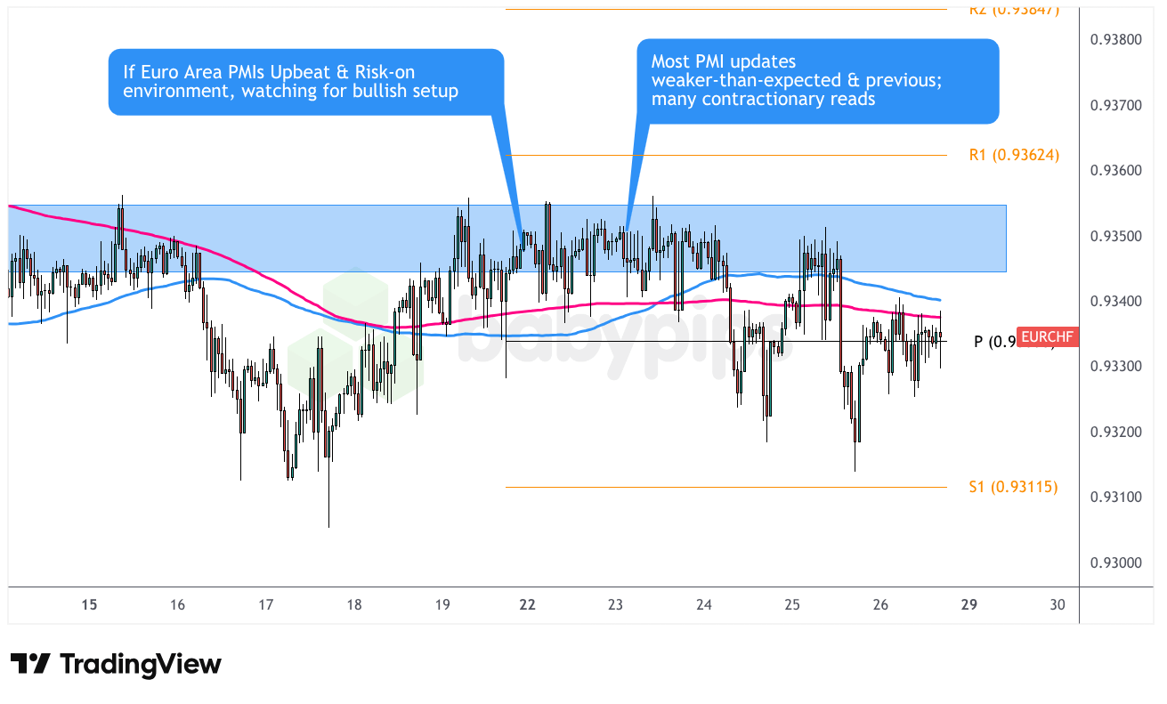 EUR/CHF entered the PMI release trading within our identified 0.9340-0.9355 resistance zone, setting up nicely for a potential bullish breakout should the data surprise to the upside.