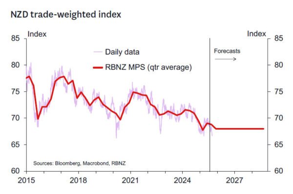 - The trade-weighted exchange rate has fallen around 2% below the RBNZ’s August MPS assumption, reflecting the market’s reaction to the weak June quarter GDP data and the pricing of a 2.25% terminal rate for the OCR.
